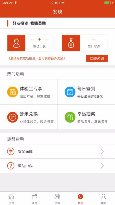 5、点击发现,查看热门活动、服务帮助和邀请好友的明细