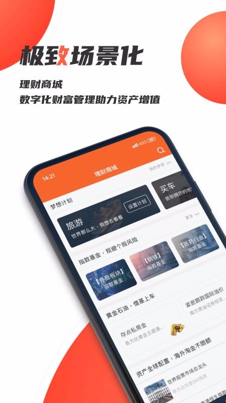 1、提供场景化的理财商城,用户可以根据不同的场景选择详细了解产品等;