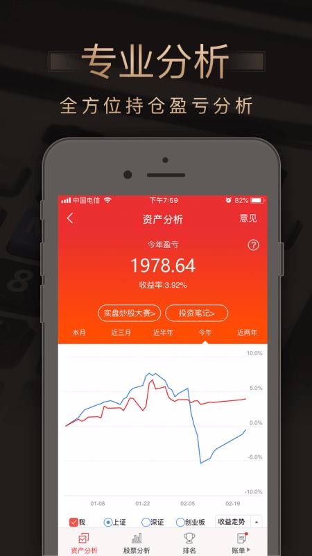 3、所有的资产盈亏分析都非常的全面,可以查看上证、深证等信息;