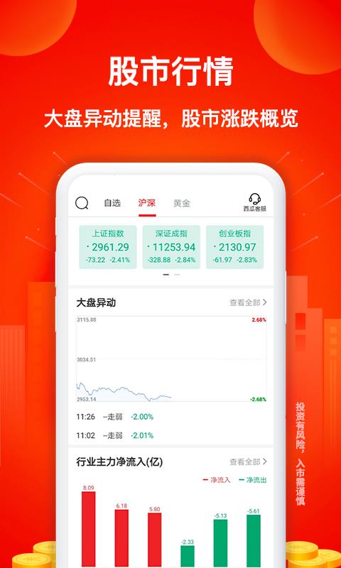5、股市行情,提供大盘异动和行业主力净流入等数据,并有相关的图表呈现变化;