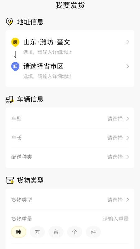4、点击发货,在线编辑地址信息、车辆信息以及货物的类型,一键发布