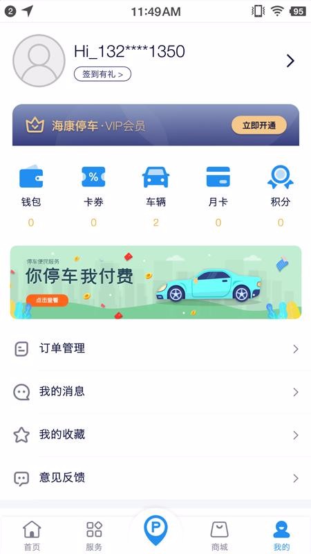 1、推送了常用的车主服务,首页为用户提供停车缴费、违章查询以及订单管理等常用服务;