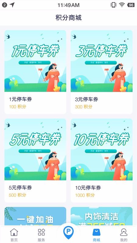 5、购买停车优惠券,可以在商城里面挑选需要的优惠券并立即使用积分兑换购买;