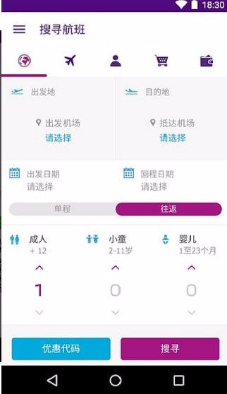 2、提供多种航班搜索填写内容,其中有出发和抵达机场,还有出发日期和回程日期多种内容;