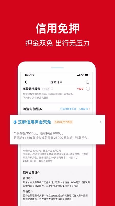 4、提供了详细的租车说明,包括取车必备条件、芝麻信用免押金、附加服务、租车费用等;