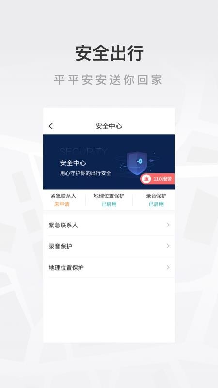 3、为守护乘客出行安全,为用户提供录音保护和地理位置保护,平平安安回家;