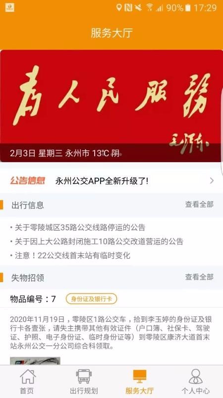 4、进入服务大厅后,就可以了解公告信息、出行信息、失物招领等通知