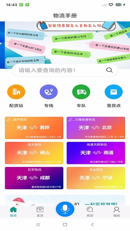 物流手册是一个专业的货运服务平台,为用户提供发货找货多种功能,还能在该软件中轻松查询不同的专线物流服务项目,找到需要的货运线路;里面打造了清晰多样的服务功能专区图标,在首页直观地展示了配货站、专线以及车队等多种资源查询专区,用户在这里能根据需要自由挑选相应的服务图标并点击打开,从这些专区里面找到自己想要的服务内容;上面还给用户带来非常热门的线路推荐标签,这些标签展示效果非常美观,起始位置地点清晰,满足大部分用户的线路查询需求,给广大用户带来线路查询便捷,此外还给用户开设了发货、找货等中心,让货运服务更简单。