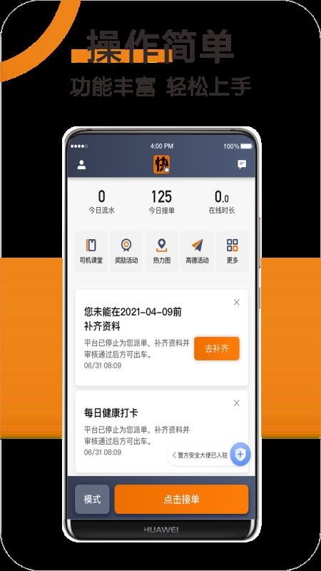 快来车是一个网约车司机接单平台,为广大车主用户提供日常接单出行服务,能够实时查看附近乘客订单的信息,可以清楚上车的地点和目的地,结合目前所在的位置,可以轻松接单或者抢单,按照订单预约的时间去接乘客,并安全的将乘客送往目的地,每完成一笔订单后都会实时记录下来,汇总统计每天接单的情况,按照不同订单收入数据,及时了解收入总额,为司机提供额外的收入;在线接单可以打破传统路边拉客的方式,清楚了解乘客热力值的信息,到乘客较多的地方,并实时更新众多的订单,满足用户接单的需求。