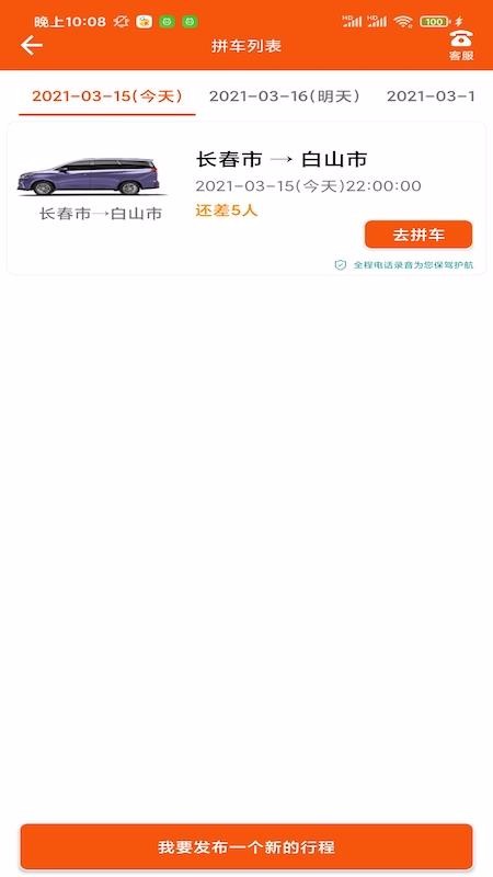 2、提供了拼车列表,选择时间点之后,可以查看推荐的拼车单,一键就可以完成拼车;