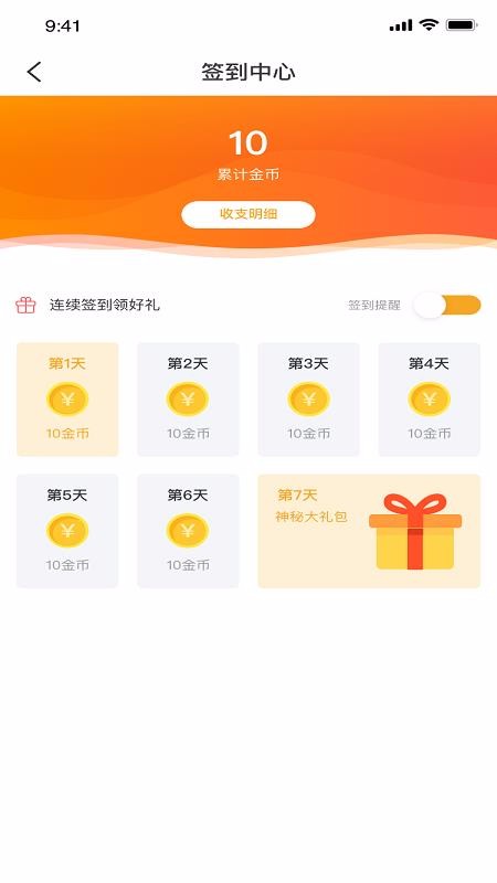 6、连续签到送好礼,软件设置了签到中心,给用户提供签到送金币的奖励,连续签到还有神秘好礼相送;
