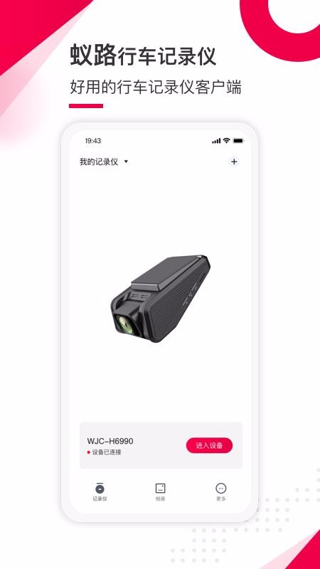 蚁路app是一款简单方便的行车记录仪管理软件,让你全面的了解行车记录仪的情况,行车记录仪的管理变得更简单;你将行车记录仪连接网络并进行匹配,设备添加更方便,并在线管理设备,知道设备的情况,设备管理更方便;在相册中查看行车记录仪拍摄的视频,并选择观看,了解视频的情况,观看更方便,并在观看时将重要的信息进行拍照记录并保存,重要的证据进行安全管理;然后将没用的视频删除,释放更多的内存,行车记录仪能记录更多的视频,提高设备的使用体验,提高设备管理的能力,快来下载使用吧,行车记录更方便。