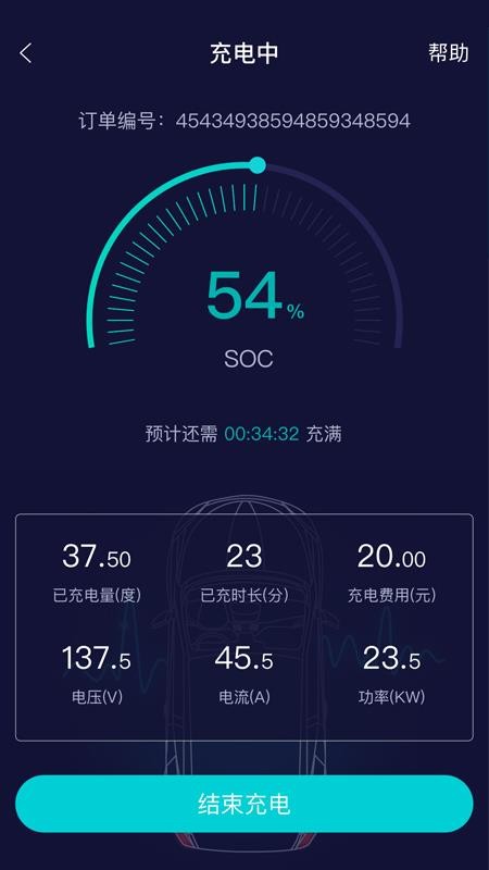 5、进入充电的页面中,查看正在充电的数据和充电的信息,实时结束充电