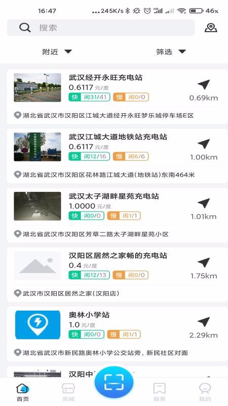 4、一目了然的充电站列表信息,充电站列表中展示每个电站价格、快充和慢充的闲置空余数量信息;