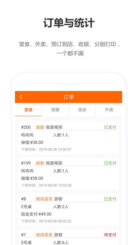 3、应用中有详细的订单分类,分为堂食、收银、活动和外卖四个版块;