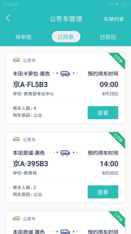 3、进入公务车管理版块,查看各个公务车使用申请内容,一键同意或驳回