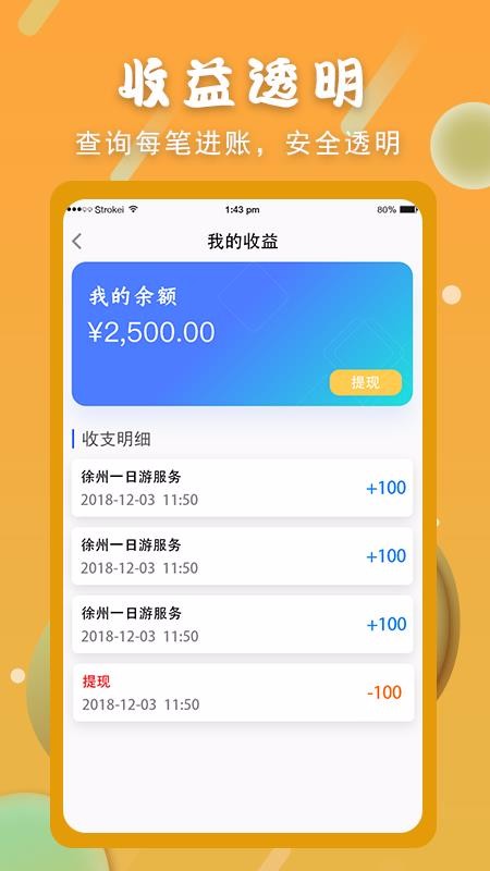 1、清晰明了的收支明细,我的收益中还设置收支明细展示栏并展示清晰的明细内容;