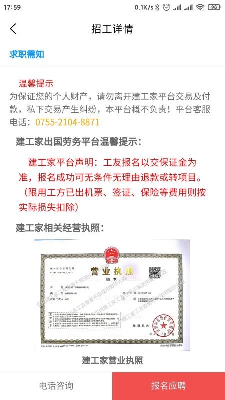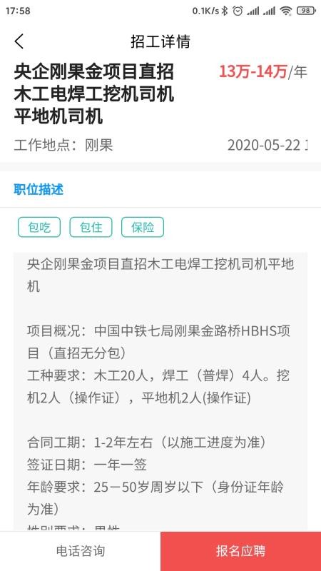 4、进入招工详情,查看详细的职位描述内容,快速进行电话咨询,一键报名应聘