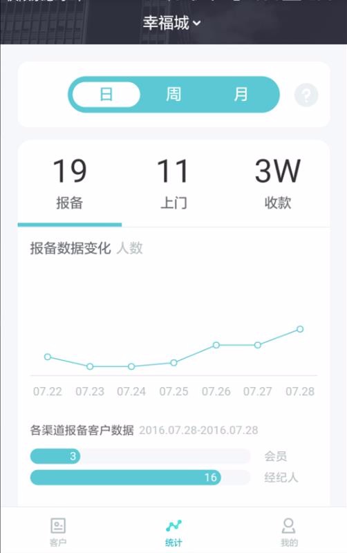 1、展示丰富的统计数据栏内容,统计中心为用户展示了报备、上门以及收款多种数据内容;