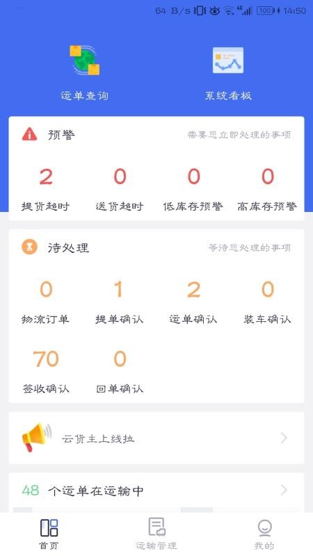 2、在首页中查看各种各样的预警信息和待处理运单详情,快速进行处理