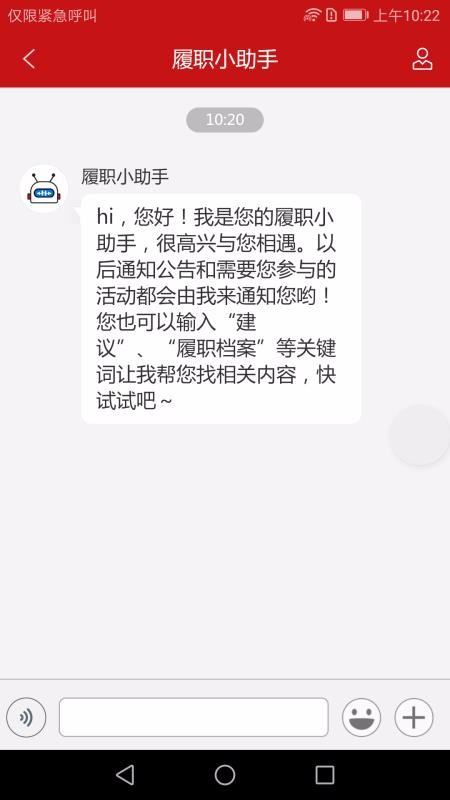 3、点击履职小助手后,就可以发送聊天消息进行沟通,也支持发送表情