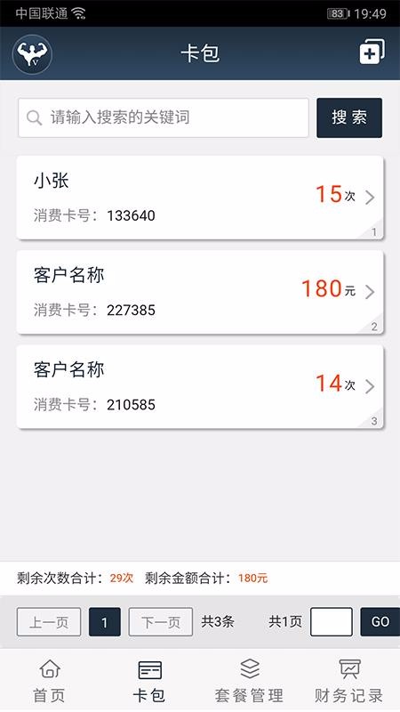 2、一站式管理多个客户,数量不限,也统计了电子卡的剩余次数、剩余金额;