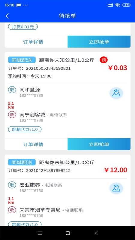 3、进入待抢订单版块,查看各个待抢订单详细内容,快速进行抢单