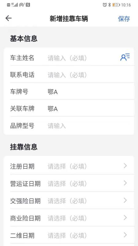 3、进入新增挂靠车辆版块,填写车辆基本信息和挂靠信息,一键保存