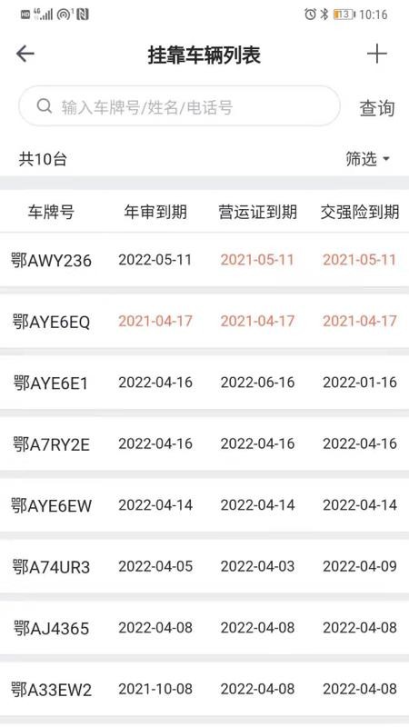 5、打开挂靠车辆列表,在列表中查看各个车辆的详细信息,了解车辆年审和保险到期时间