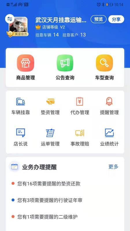 哇卡运挂靠版app是一款为卡车挂靠公司提供服务的软件,让用户能够更轻松的管理各种业务,提高工作效率;用户在软件中可以看到各种各样的提醒内容,快速对各种业务办理内容进行处理,提高业务办理的效率,省时又省心,并且用户可以找到多种类型的管理功能,为用户的日常管理工作带来更多的便利,让管理工作变得更加简单轻松,同时用户能够看到各种各样的统计内容,根据统计图表了解自己的详细工作业绩信息,掌握业绩变化情况;快下载这款软件试试吧,方便快捷的管理各个挂靠车辆,更高效的完成工作。