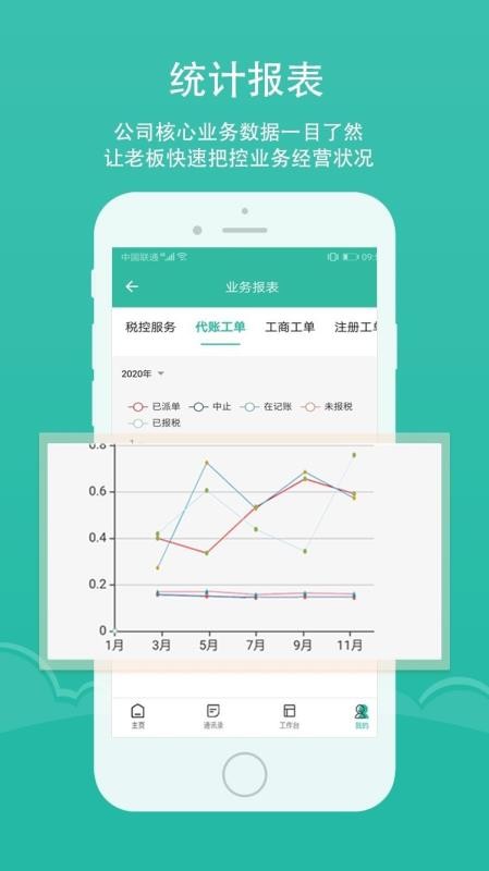 5、提供多种业务报表内容,包括税控服务、代账工单、工商工单和注册工单等;