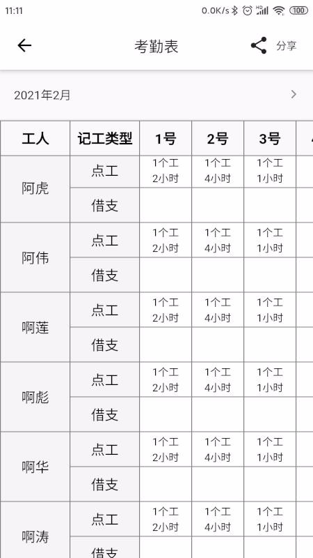 6、清晰的考勤表,考勤表里面以表格形式展示了每个工人的记工类型、每天的记工数据信息内容;