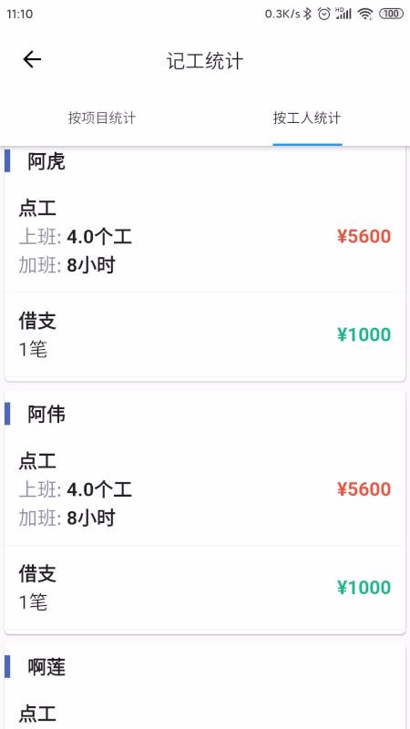5、提供多种记工统计展示栏目,记工统计专区提供按项目统计和按工人统计的两种栏目;