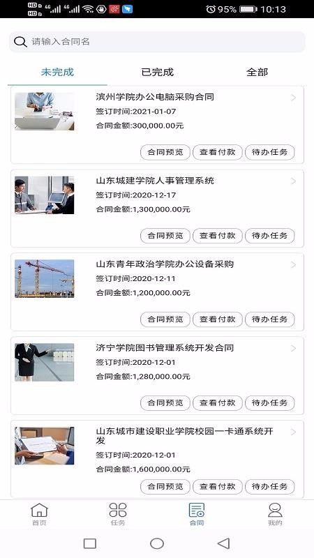 5、便捷的合同管理工具,每一份合同上面都设置了合同预览、查看付款和待办任务标签;