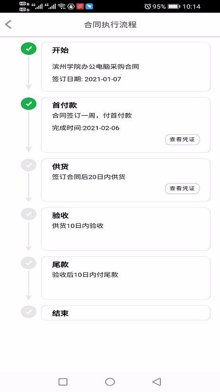6、清晰的合同执行流程,该流程中展示从开设到结束每个流程,还展示当前的位置和不同位置的凭证查看标签;