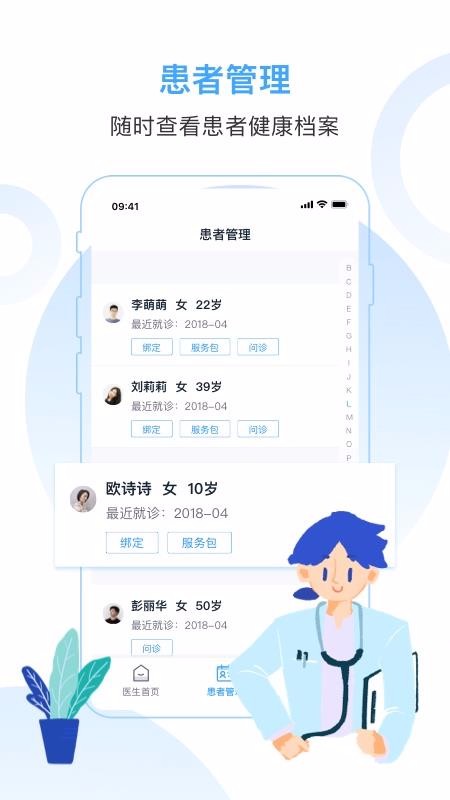 2、拥有多种患者管理工具,美观患者封面都设置了绑定、服务包以及问政等工具;