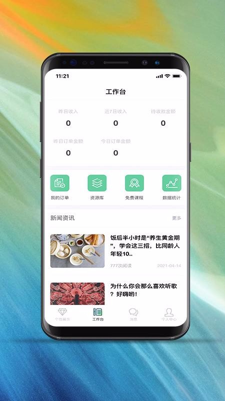 3、在工作台中,为用户展示了订单、资源库、免费课程、数据统计、新闻资讯等信息