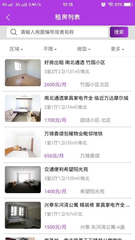 4、为用户清晰显示各个房源的价格、面积、户型和朝向等信息,方便了解;