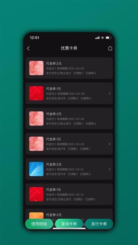 3、一站式管理发行的卡券,随时可以掌握发行状态,了解卡券的领取数量和使用数量;