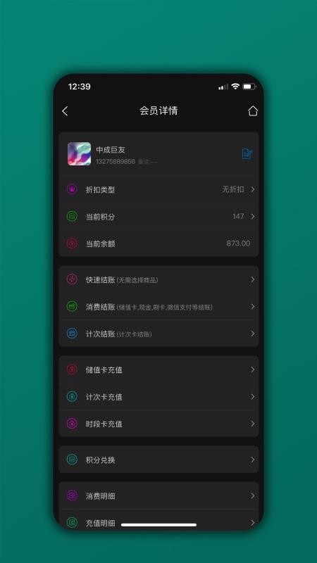 3、支持消费结账,包括快速结账、储蓄结账、自动折扣、自动积分等功能;