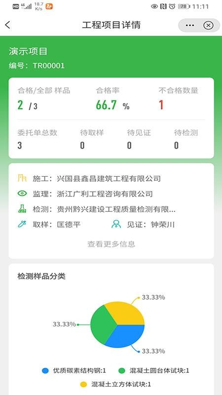 5、提供工程项目详情版块,让用户可以看到详细的合格情况和检测样品分类信息;