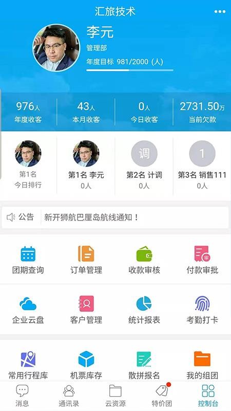 汇旅通app是一款为各个旅游相关商家提供服务的软件,帮助用户更轻松的办公,提高工作效率;用户在软件中能够看到各种各样的数据内容,通过数据了解旅游产品的销售情况,掌握自己和其他成员的业绩详情,并且用户能够快速进行各种审核和审批,为用户的工作带来更多的便利,让工作变得更加简单轻松,提升用户工作体验,同时用户可以看到各个客户信息,了解客户的旅游需求,从而更精准的为客户推荐合适的旅游产品,让客户享受更优质的旅途;快下载这款软件试试吧,更加轻松的进行线上办公,快速提高自己的业绩。