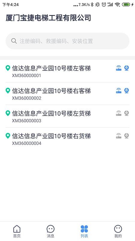 5、打开列表版块,查看不同位置的各个电梯信息,了解电梯当前的状态