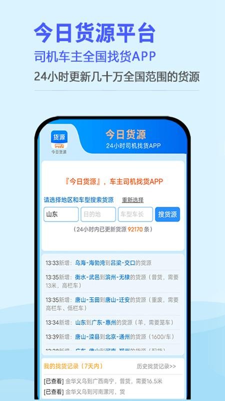 2、在首页中查看新增的货源信息,了解自己的找货记录,快速搜索货源