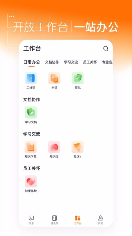 2、便捷多样的工作台划分栏目,该栏中涵盖日常办公、文档协作以及专业应用等栏目;