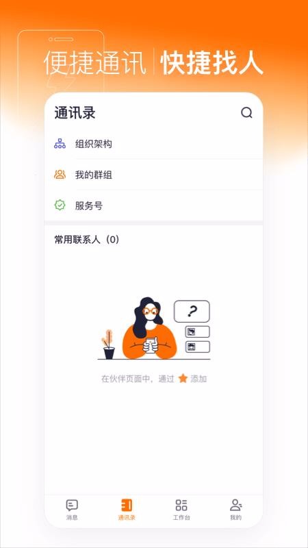 1、多种通讯录查询分类,除了组织架构外还提供我的群组和服务号等查询方式;