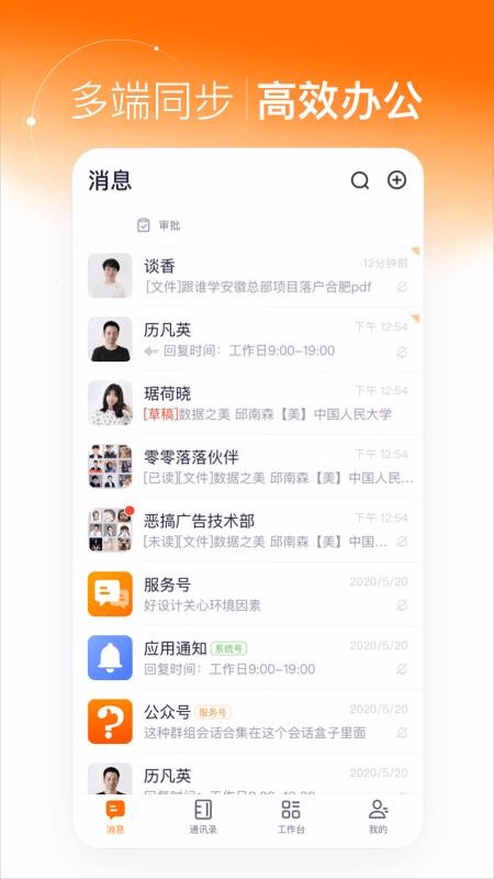 5、展示多样的消息通知,消息中心除了群聊和私聊信息外还有服务号、公众号以及应用通知多种消息;