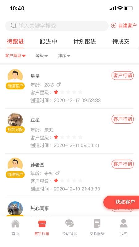 3、进入数字行销版块,查看不同类型的各个客户信息,快速进行客户行销