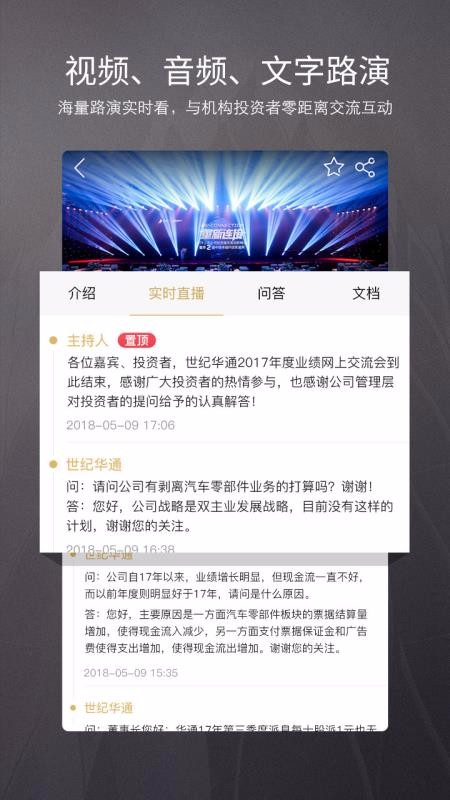1、显示丰富的路演内容栏目,其中有介绍、实时直播、问答以及文档内容栏目;