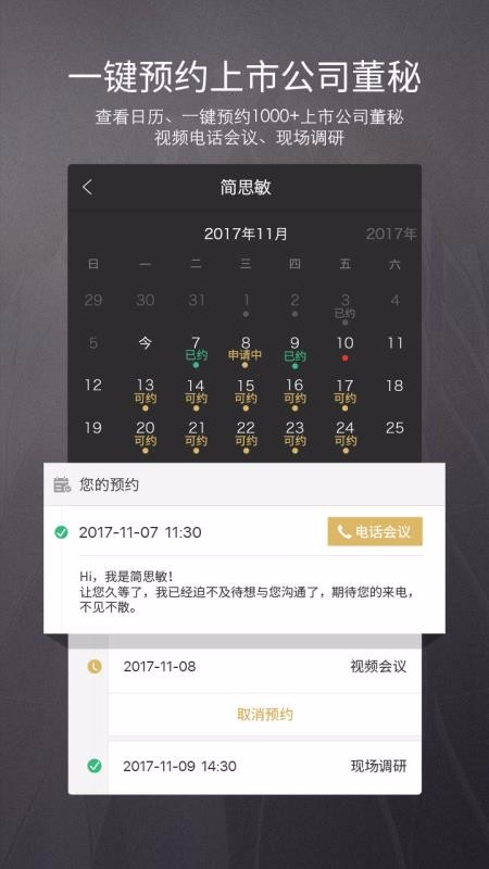 5、一目了然的公司董事秘书预约日程,里面为用户展示清晰的日程安排日历视图,可预约状态一目了然;